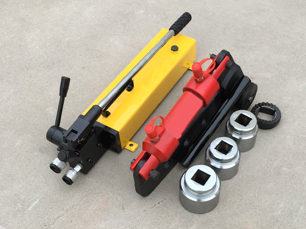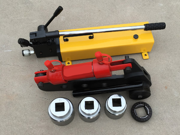 手動(dòng)高壓泵由操縱手柄,高壓泵、換向閥、油箱、壓力表和帶快速接頭的輸油管等組成。帶棘輪式液壓扳手由高壓油口、液壓油缸、曲柄、反力桿、棘輪裝置、套筒等組成、前者系動(dòng)力源部件,后者為扭矩執(zhí)行機(jī)構(gòu)。